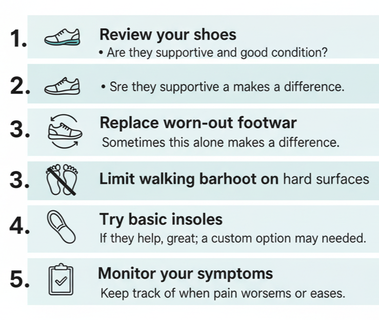 Try basic insoles – If they help, great; if not, a custom option may be needed.